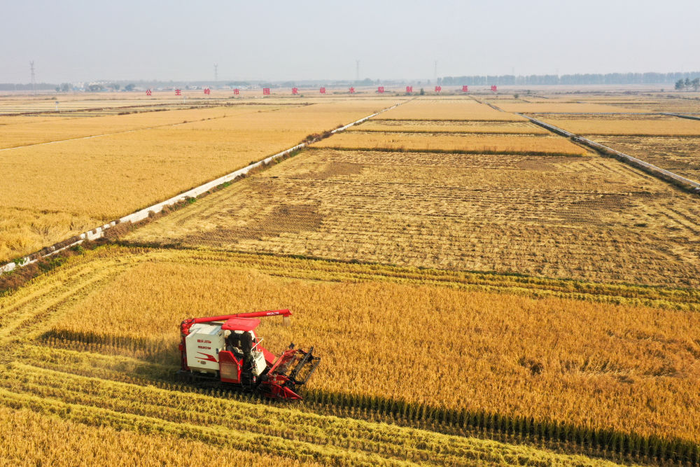 2025年10月14日,在吉林省公主岭市,农民驾驶农机收割水稻(无人机照片) 新华社记者 张楠 摄