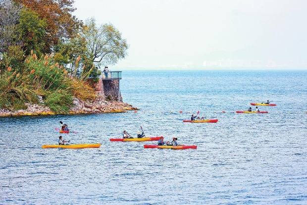 图为市民游客在抚仙湖明星鱼洞风景区体验皮划艇运动。